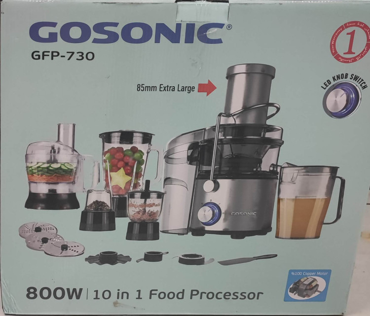 آبمیوه گیری Gosonic مدل 730 یک وسیله ی بسیار کاربردی با ظاهری زیبا و بدنه ای محکم انتخابی مناسب برای آشپزخانه هااست.آبمیوه گیری چندکاره گوسونیک از دیگر محصولات چندکاره این شرکت است که با قابلیت هایی همانند آبمیوه گیری، آسیاب، خردکن و مخلوط کن عرضه شده و نبض بازار را به دست گرفته. تیغه های تمامی این دستگاه ها از جنس استیل ساخته شده که علاوه بر استحکام و طول عمر زیاد، موجب تسریع در عمکردها نیز می شود . دهانه عریض ورودی این آبمیوه گیری چند منظوره گوسونیک،85میلی متراست که آبگیری میوه بزرگ و کامل را بدون هیچ زحمتی امکانپذیر می کند پارچ شیشه ای مخلوط کنGosonic با ظرفیت 1.5 لیتر، امکان میکس کردن انواع مواد سرد و گرم را بدون نگرانی مهیا می کند. همچنین جهت افزایش امنیت و اطمینان خاطر، این مدل به قفل ایمنی نیز مجهز شده تا در صورت عدم جایگیری درست قطعات، فعالیت موتور به هیچ وجه آغاز نگردد.