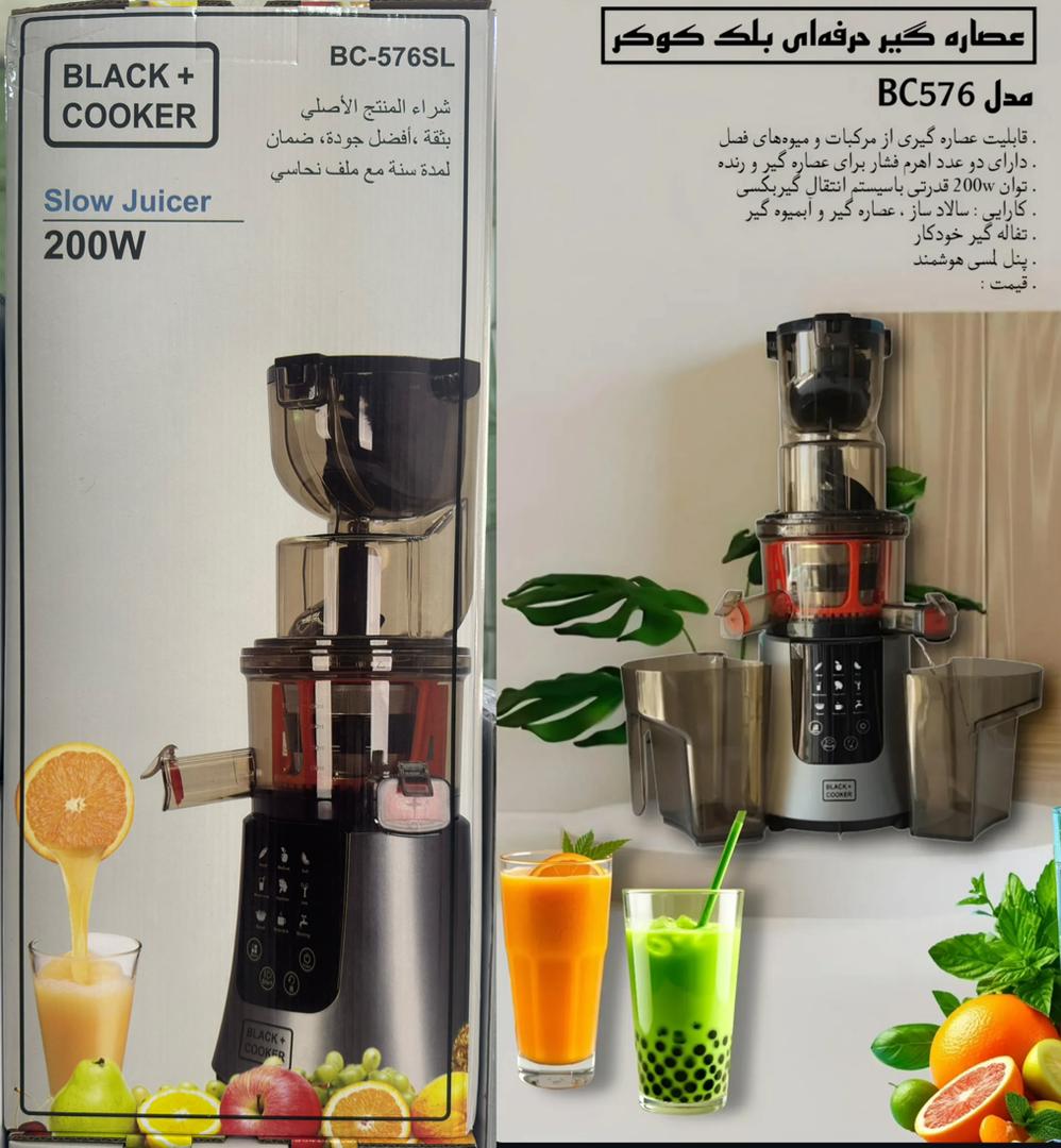 •نوع محصول:عصاره گیر •برند: بلک اند کوکر •کد:576 توان مصرفی:200وات •تولید آبمیوه ای که شامل 90 درصد ویتامین است •سیستم فشار آهسته جداسازی آب میوه و فیبر •عملکرد هوشمند برای انواع غذا با 8 منو متفاوت •موتور بیصدا •بیست دقیقه زمان کار مداوم •سیستم ایمنی دوگانه •دارای تیغه و بلندر های متفاوت •دارای فیلتر •گارانتی 12 ماهه معتبر شرکتی و 5سال خدمات پس از فروش