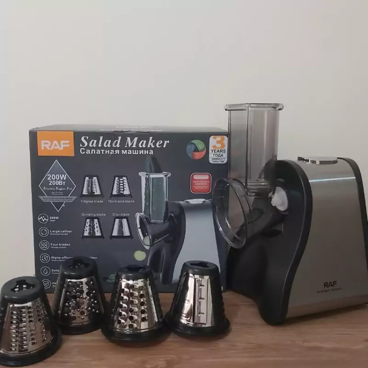 سالاد سازها می توانند با سرعتی معین سبزیجات را به یک سایز برش دهند، در واقع این وسایل برادر کوچک غذا سازها می باشند. طراحی سالاد سازها (رنده برقی) به گونه ای است که در همان نگاه اول می توان طرز کار با آن را یاد گرفت و با توجه به سایز دهانه ورودی دستگاه می توان از آن برای برش زدن و قطعه کردن انواع مواد غذایی استفاده کرد. کمپانی راف با در نظر گرفتن این نیاز، سالاد سازی تولید کرده است که با آن میتوان انواع مواد غذایی را با 4 دیسک خود که برای آن در نظر گرفته است برش زد. این سالاد ساز دارای 4 دیسک برای برش رشته ای نازک، ضخیم، خلال و رنده یا آسیاب می باشد. یکی از مزایای مهم در این نوع سالاد ساز قدرت موتور، جنس و نوع تیغه های آن می باشد، موتور این سالاد ساز با توان 200 وات بوده که برای انجام اموری ساده نظیر خردکن موادغذایی از توانی کافی برخوردار است. همچنین موتور این دستگاه دارای تنظیمات سرعت به صورت فشاری می باشد و جنس تیغه ها نیز از استیل ضد زنگ می باشند و زمانی که با قدرت موتور بالا ترکیب می شوند توانایی خرد کردن انواع مواد غذایی را دارند. همچنین این سالاد ساز قابلیت جدا سازی قطعات دارد و پس از کار می توان تک تک اجزای آن را شسته و از تمیزی آن اطمینان خاطر داشت.